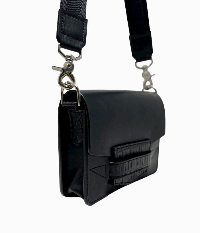 Black latigo leather cross body, slot bag with black alligator accents and interior pocket. Silver hardware with black textured nylon shoulder strap. (8”W x 6”H x 2”D)