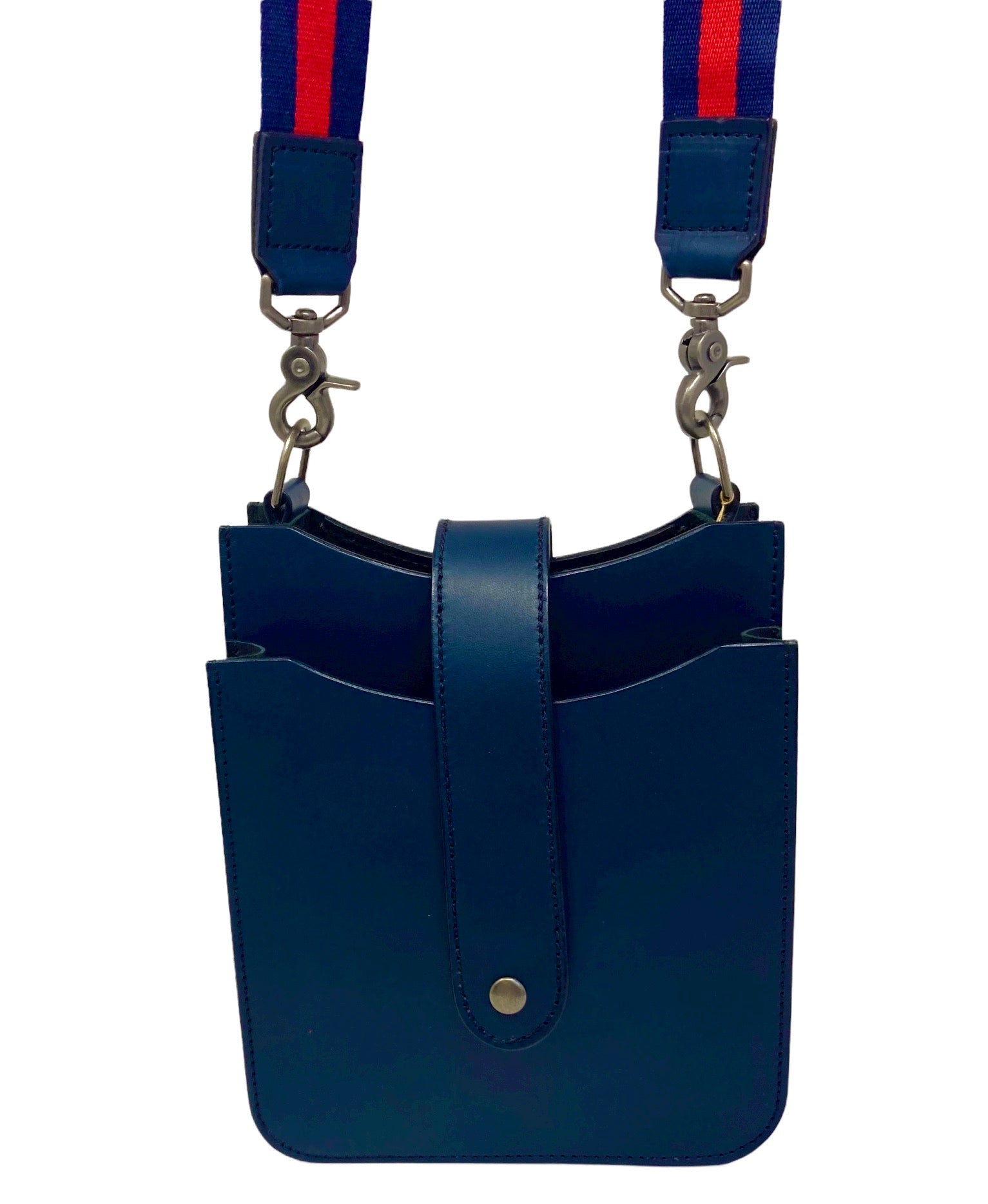 Navy Hermann Oak leather two-pocket bag with antique silver hardware and blue & red striped shoulder strap.(7.5”W x 9”H x 3.75”D)