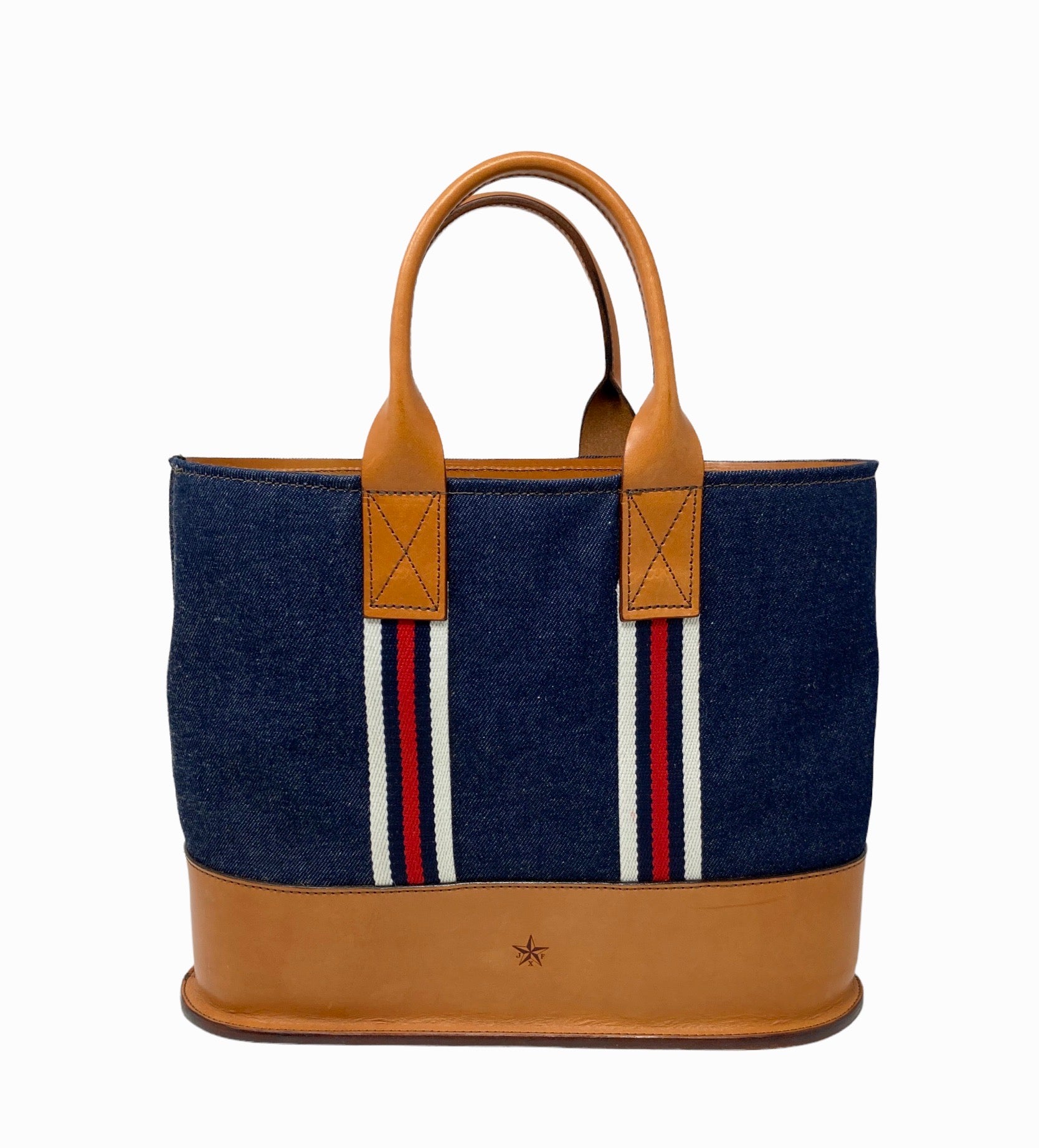 Selvedge denim tote bag trimmed with Hermann Oak bridle leather and cotton red, white & blue webbing with interior iPhone pocket. (13.25”W x 11”H x 4.5”D)