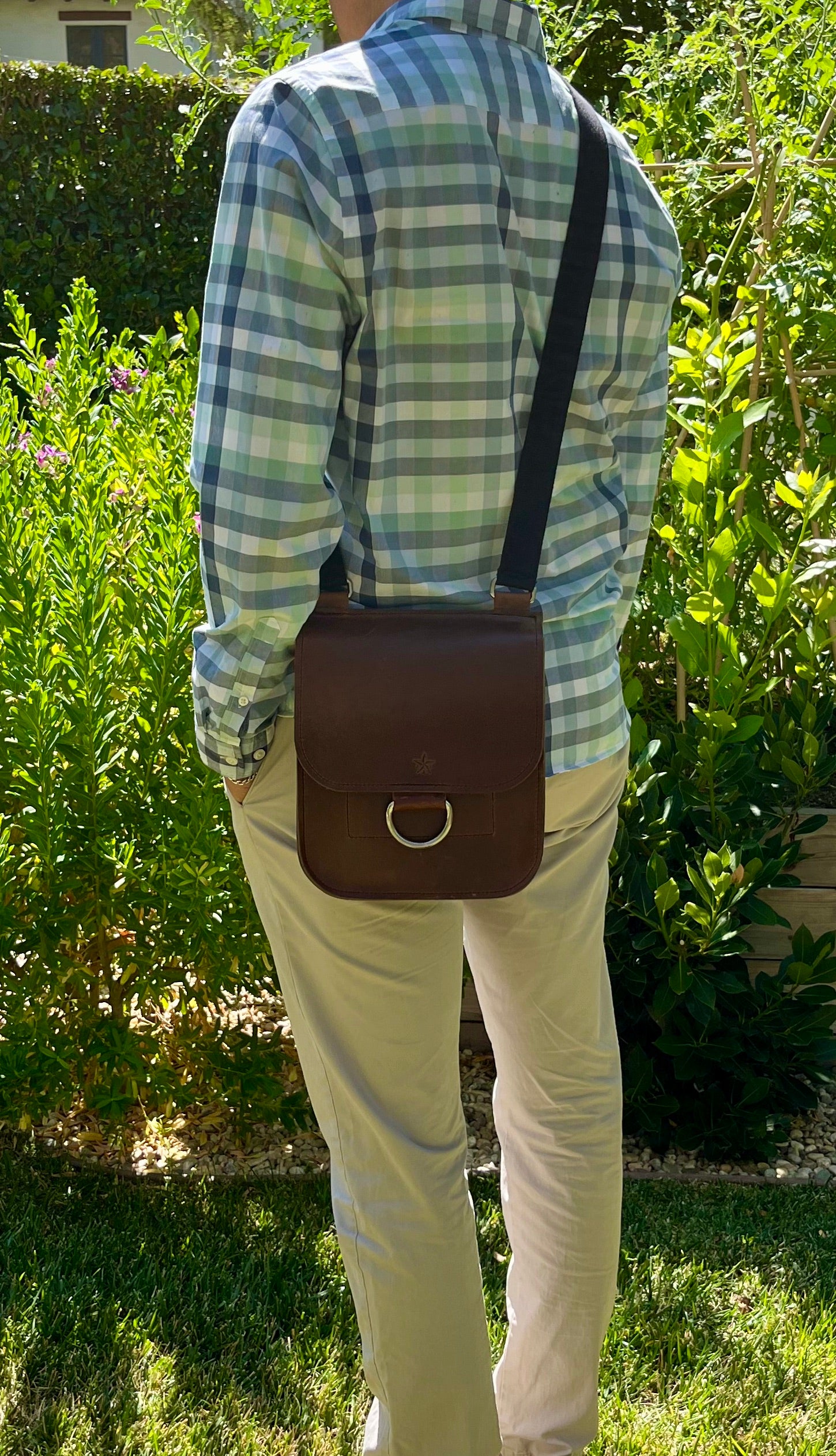 Brown oil tan messenger bag with black nylon shoulder strap. Interior iPhone pocket and rear panel pocket. (8.5”W x 10”H x 3”D)