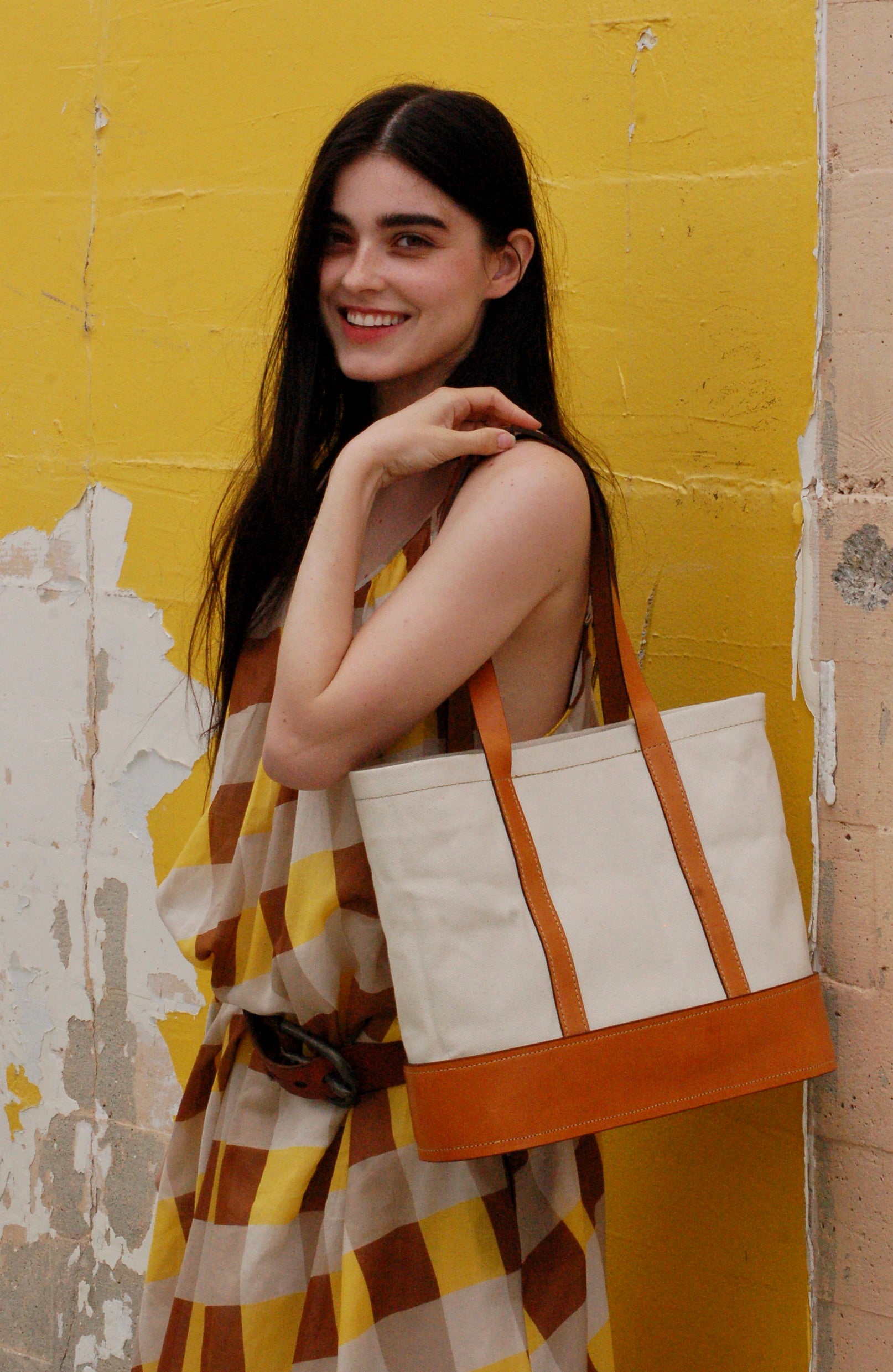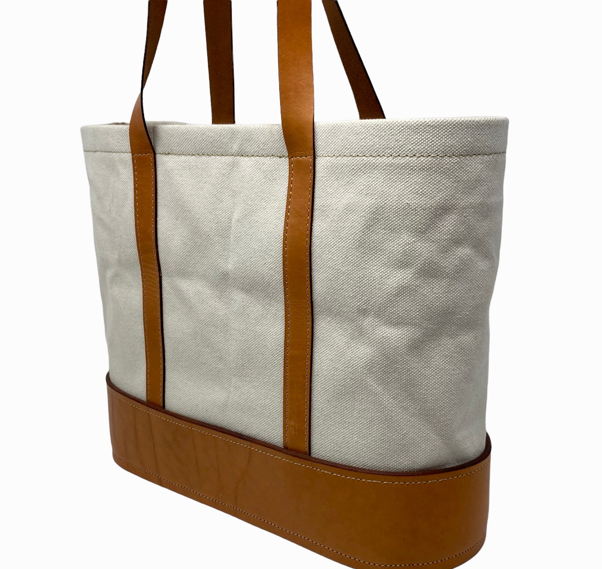 Heavy duty white canvas, over-the-shoulder tote bag trimmed with Hermann Oak bridle  leather with two interior pockets. (14.5”W x 12”H x 5”D)